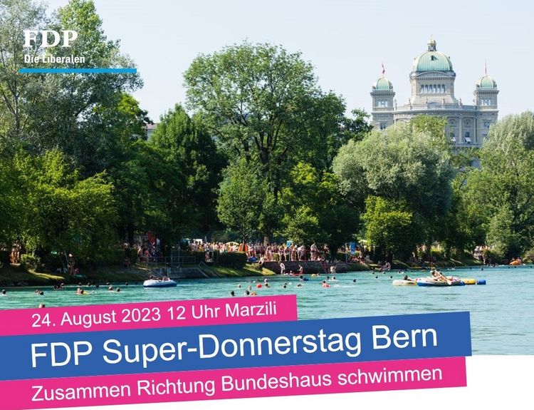 Die FDP Stadt Bern hat am 24. August mit einer gelungenen Aktion den Wahlkampf für die nationalen Wahlen bei den Bürgerinnen und Bürgern gestartet. Beim gemeinsamen Aareschwumm vom Eichholz Richtung Bundeshaus machten die freisinnigen Nationalratskandidierenden auf die heikle finanzielle Situation der Stadt Bern aufmerksam.